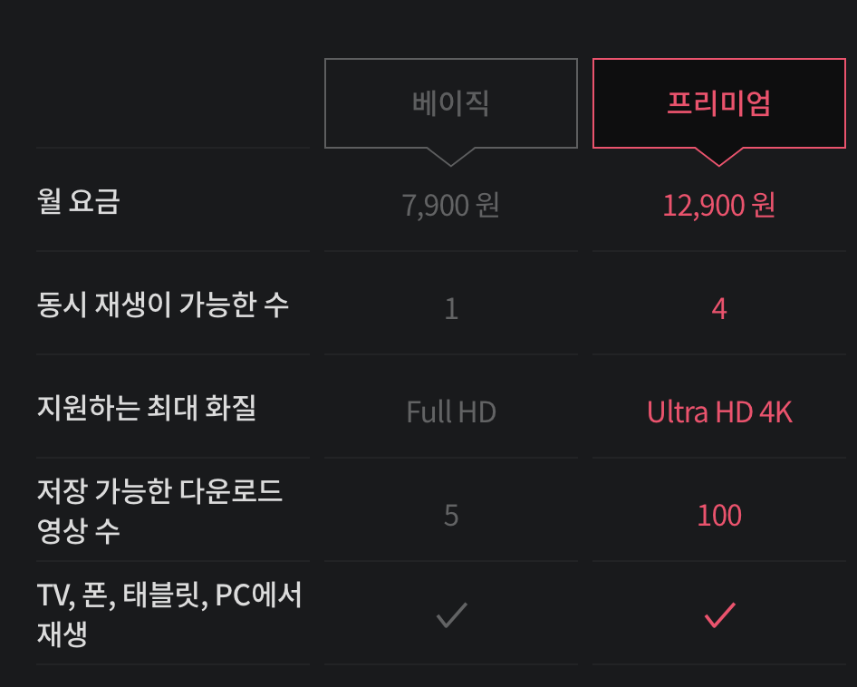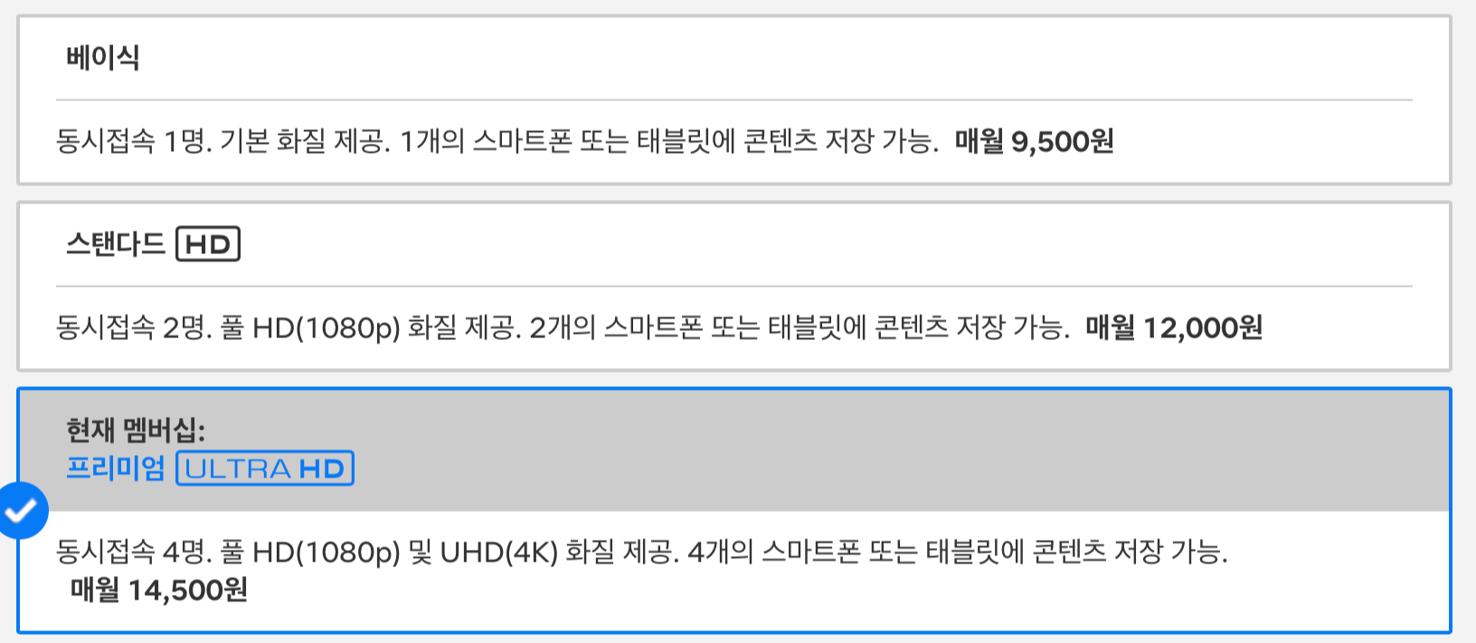 국내서 최고의 주가를 달리고 있는 넷플릭스는 세 가지 가격 정책을 제공합니다. 프리미엄 결제 시 본인이 가지고 있는 기기가 4K를 지원하는지 알아보고 하셔야 합니다!